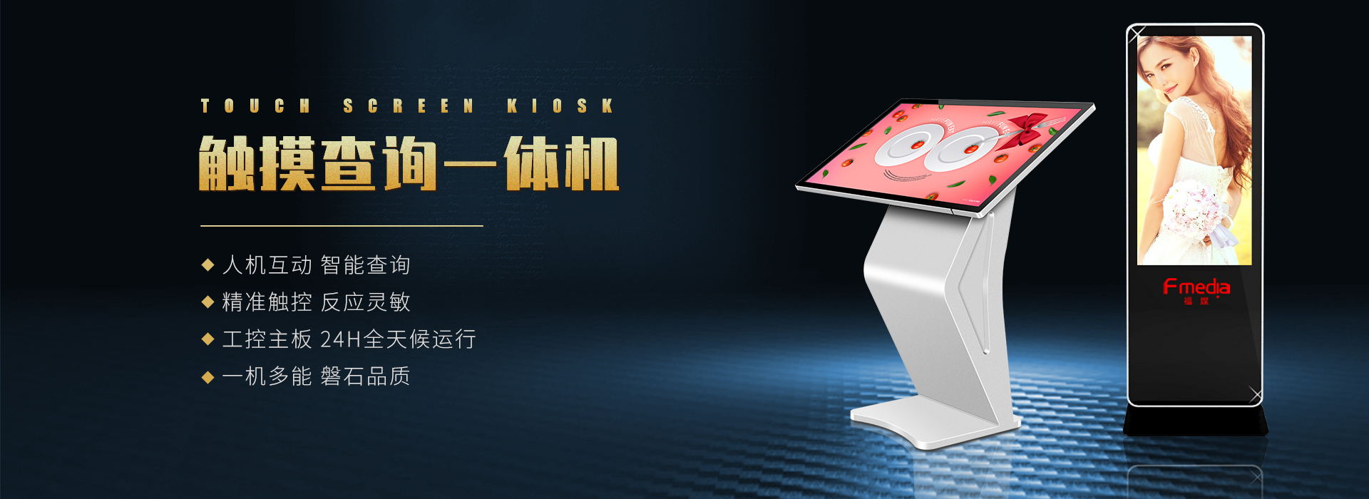 福媒專業生產觸摸一體機、戶外廣告機、體感試衣魔鏡、AR拍照簽名一體機、虛擬翻書、觸控拼接、3D全息展柜、透明櫥窗、多屏融合、智能中控和多媒體數字展廳類互動顯示設備;可承接OEM、ODM訂單及多樣化量身定制服務。